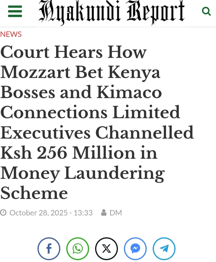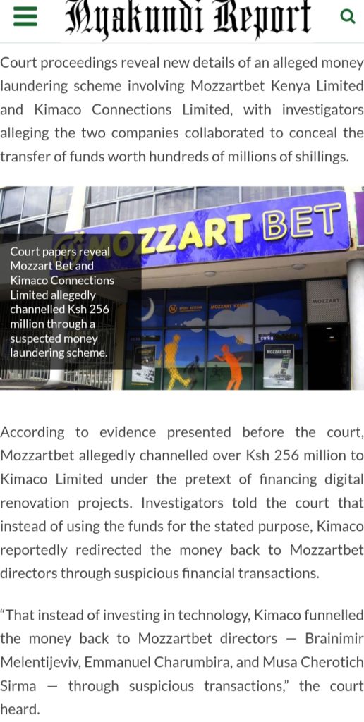 New details have emerged in court over what investigators describe as a major money laundering scheme involving Mozzartbet Kenya Limited and Kimaco Connections Limited.