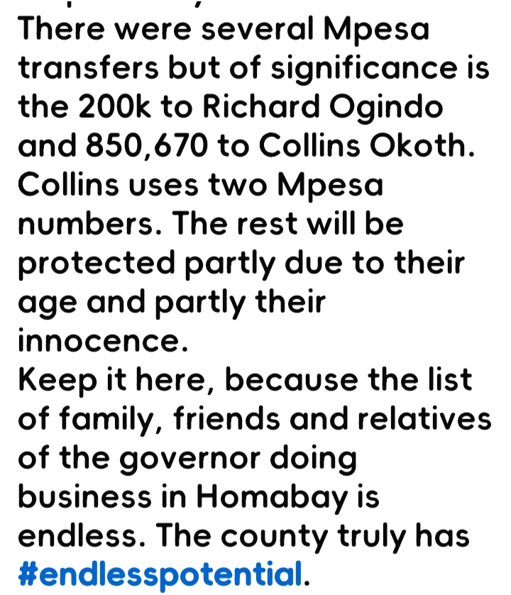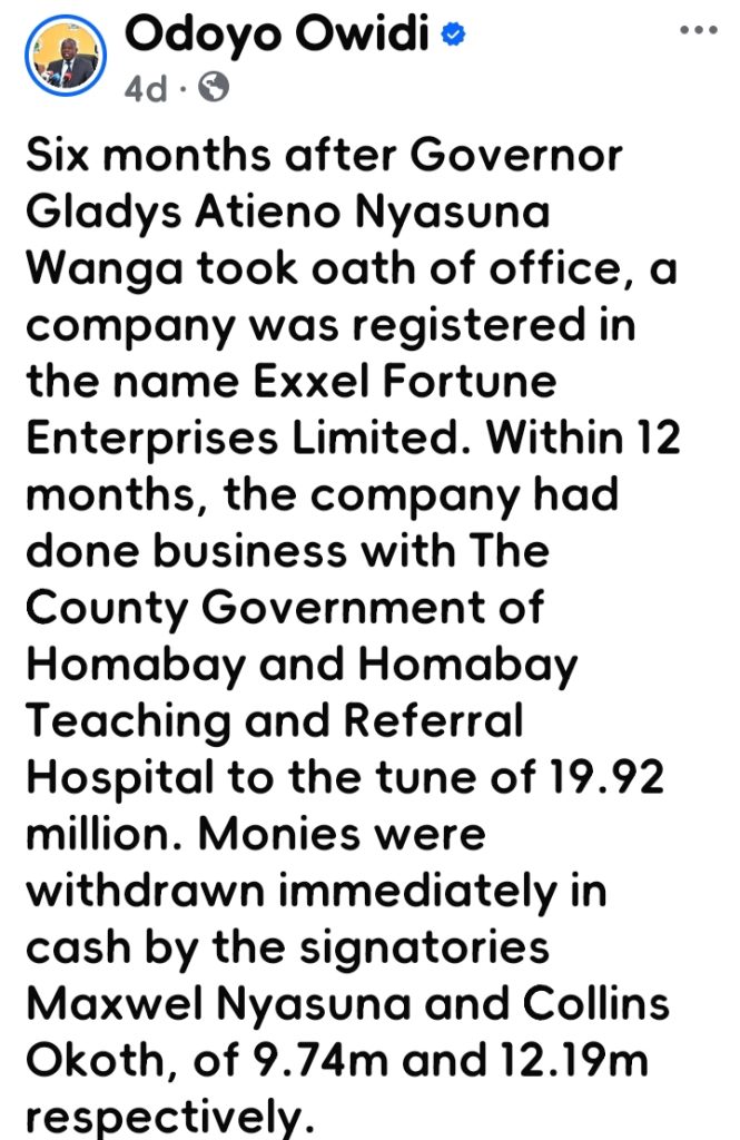 Beyond Exxel Fortune, critics say the web of corruption in Homabay extends much further. Family members, political allies, and friends of the governor are said to be cornering tenders and contracts across various departments.